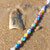 Kleine Silberpyramiden im Einklang mit unserem Om-Zeichen und goldenschimmerder Glasperle. Die Glasperlen sind etwa 1 cm lang. Verschluss 1.